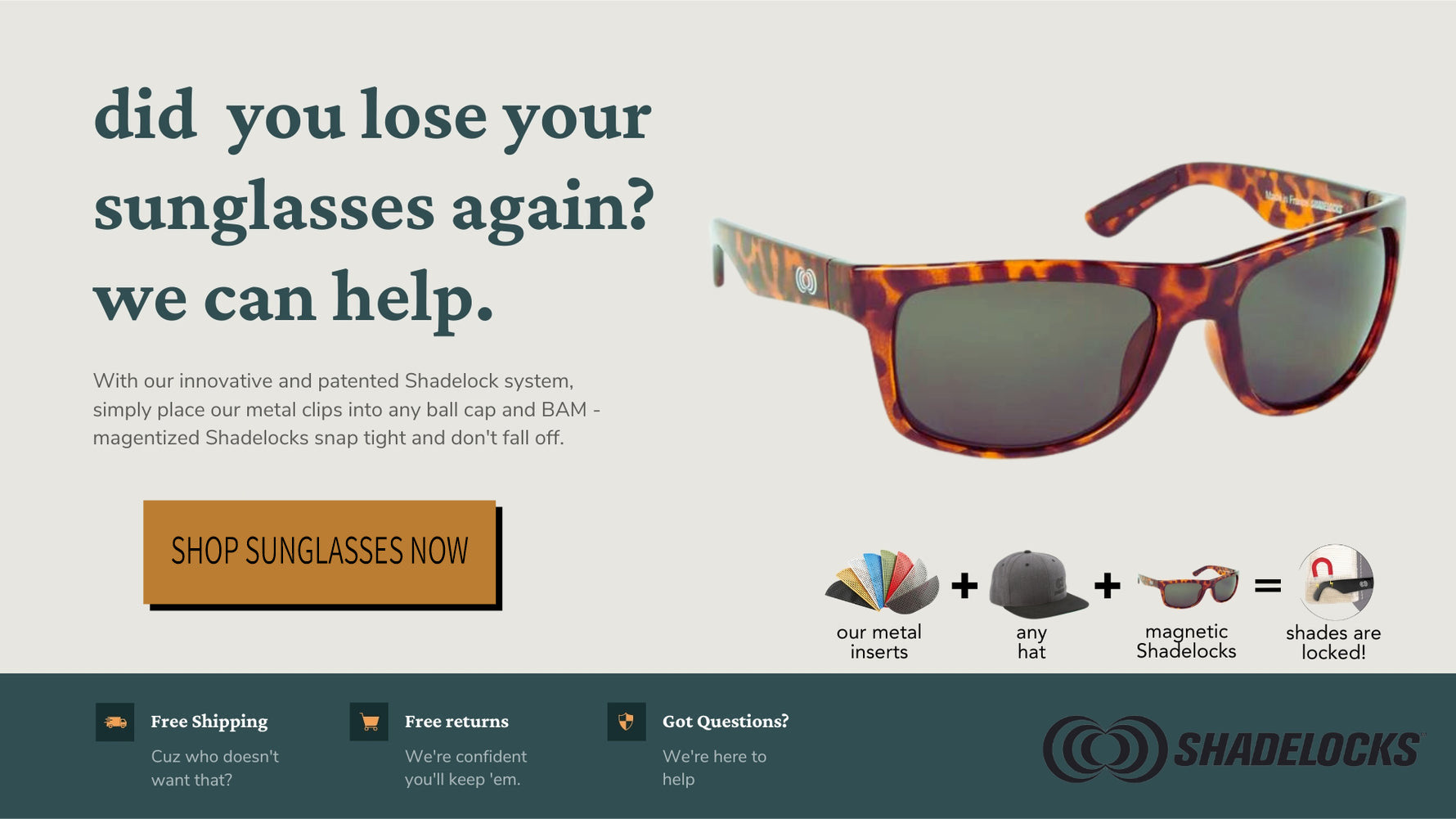 I don't know where these have been all my life. I have always been an avid wearer of hats and sunglasses, but I have dropped my sunglasses so many times from putting them on top of my hat. Or I loose my sunglasses because I put them down somewhere and forget where I put them. I hate keeping track of a sunglasses strap, I don't want to wear my sunglasses as a necklace. Shadelocks is the solution to a problem I had accepted and no longer have to. I am so glad I found this product and recommend it to everyone who wears sunglasses!!!!