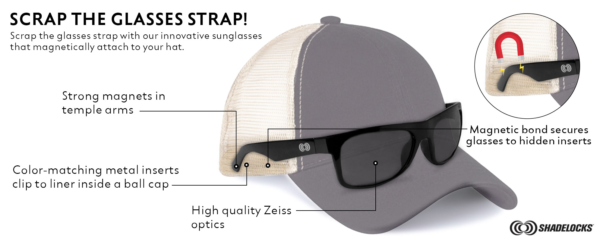 from 18 reviewsShadelocks makes great magnetic clips to keep their stylish sunglasses on your head gear in a very practical and clever way. It is great to know that my sunglasses won't go flying off my hat like regular sunglasses tend to do. The clips keep them nice and secure on my hat visor when not in use.